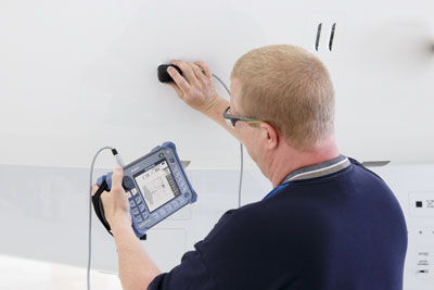 ボンドテストのメカニカルインピーダンス解析(MIA)法は、材料のメカニカルインピーダンス、すなわち弾性を測定します。MIAプローブは、固定の可聴周波数を発し、 材料の弾性の変化はBondMaster 600のX-Yビューにおける信号の振幅と位相の変化として表示されます。 MIAで使用されるプローブの先端部とBondMaster 600の高性能電子部品との組み合わせにより、複合材ハニカムの微小な剥離の検知が他の手法より簡単になりました。さらに、BondMaster 600で拡大されたMIAの周波数範囲(2kHzから50kHz)は、裏面の剥離においても効果を発揮します。 BondMaster 600にはMIA校正ガイド機能が備えられ、複合材ハニカムにおけるより小さい、そして他の手法では見つけにくい欠陥を検知するために、最適な周波数を選択できるよう設定されています。 |