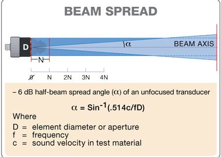 原則として、探触子が生成する音波は物質の境界面に達するまで直進します。その後に何が発生するかについては下で論じます。仮にビーム路程が近距離音場限界距離より長い場合は、ビーム径も拡大し、スポット・ライトのビームのように広がります。フラット・タイプの探触子の指向角は以下のように計算されます: