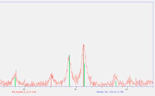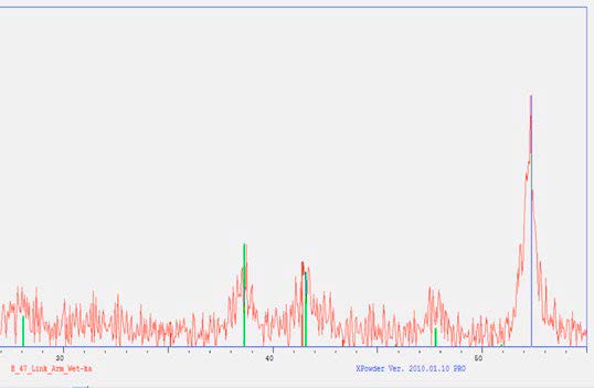 X-ray diffraction (XRD) is a commonly used technique for corrosion analysis and works well in this application. Additionally, both the TERRA and BTX II analyzers give qualitative X-ray fluorescence (XRF) data on the elemental composition of the samples. This is useful in determining the source of fretting wear debris. For example, using XRF, it was determined that fretting wear was occurring in spherical bearings in the pitch linkage. The graphic scans show the sensitivity of the samples with good peak-to-background ratios, as is evident from the representative XRD patterns shown below. |