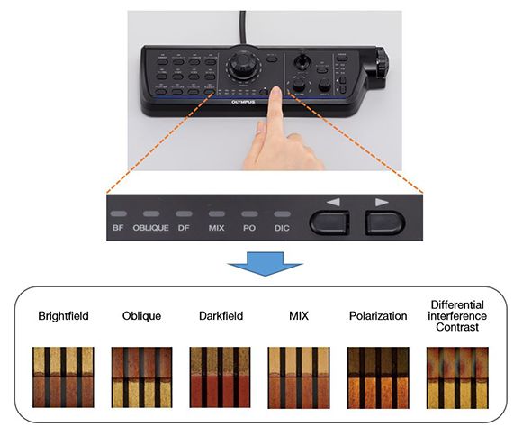DSX1000显微镜的多功能控制台可实现快速、平稳的分析。通过按下控制台上的按钮或单击用户界面,即可查看缩略图显示,其中显示六种观察方法下的样品。这样即可轻松选择适用于您应用的最佳图像,从而缩短检测时间。