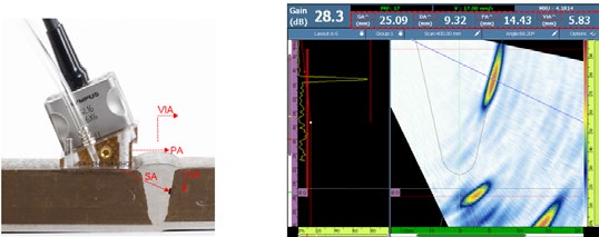 A27探头在探测远端的焊缝坡口缺陷时,表现出了较高的信噪比(SNR)。这个缺陷被正确绘制在视图中,与其在焊缝中的已知深度和位置完全匹配。缺陷深度(DA)使用最高波幅的A扫描进行测量。闸门三角学读数,如:声程(SA)、深度(DA)、探头距离(PA)以及以步进轴上的零位作为参考点的体积位置(VIA),也都被正确地绘制在视图中。 |