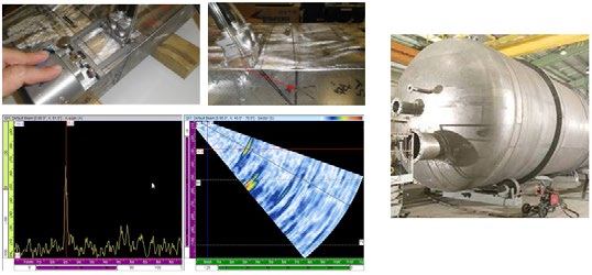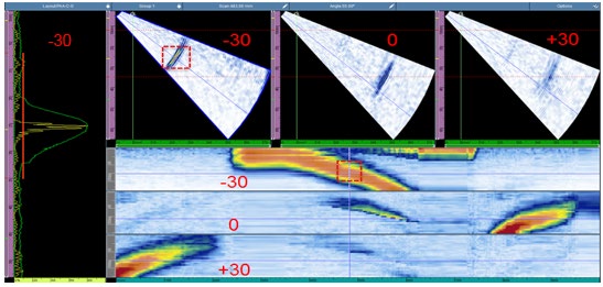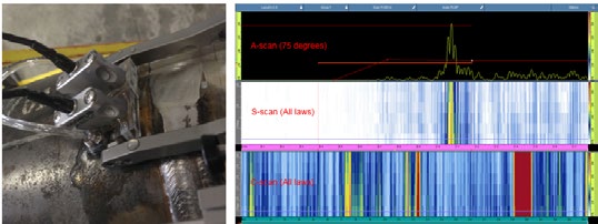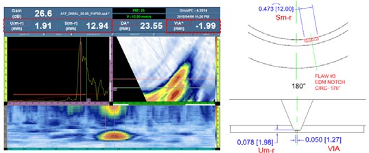 在一个直径为152毫米的铬镍铁合金800焊缝样件上,A27探头和DNCR楔块探测到了3个浅层缺陷和1个延伸到外壁的缺陷。 |