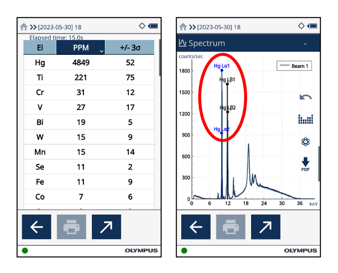 图2. 样品B的化学结果和光谱。红圈中是汞的峰值,表明样品B中存在汞。