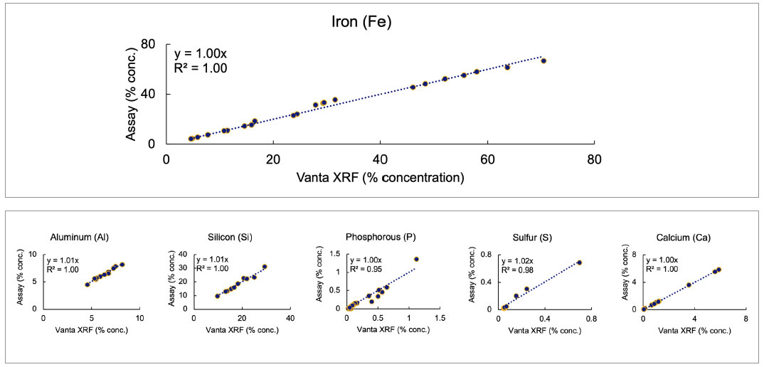 The Vanta™ pXRF analyzer demonstrated high performance over various ore samples, including hematitic breccia, hematitic banded iron formations (BIF or taconite), ferruginous soil, lateritic soil, and magnetite skarn—all matrices that commonly contain iron ore. The graphs show that the Vanta analyzer provides accurate, precise results across all matrices and concentration levels, as indicated by the slopes and R2 being close to 1.