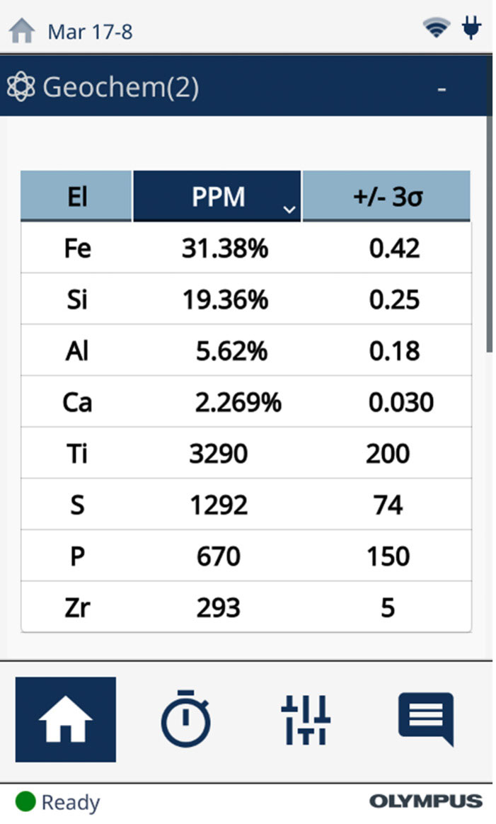 While calculating the elemental concentrations, the Vanta pXRF analyzer can also calculate these mineral and compound concentrations in real-time. With the easy-to-use interface, the user can set the instrument to report the calculated concentrations as compounds, as demonstrated in Figure 3 for a BIF reference standard. The Vanta software performs this calculation, taking only a few seconds to switch between elemental and compound reporting.