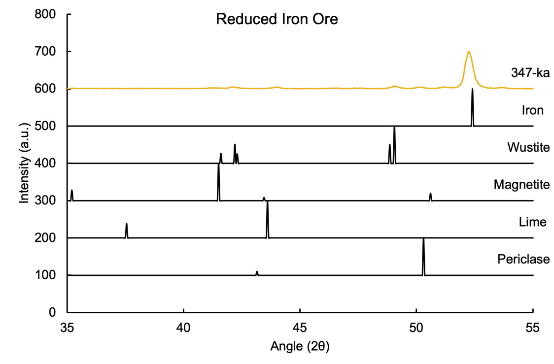 This iron ore was used to demonstrate the Evident pXRD analyzer’s ability to distinguish various iron-containing phases and any impurities in the sample. While pXRF can only quantify the total concentration of iron in the sample, pXRD can distinguish between various types. In this example, the sample has metallic iron (Fe), along with two forms of iron oxide, wüstite (FeO), and magnetite (Fe3O4). The materials also have some lime impurities left over from processing, along with periclase, a magnesium oxide that occurs commonly in nature with wüstite to form the material ferropericlase.