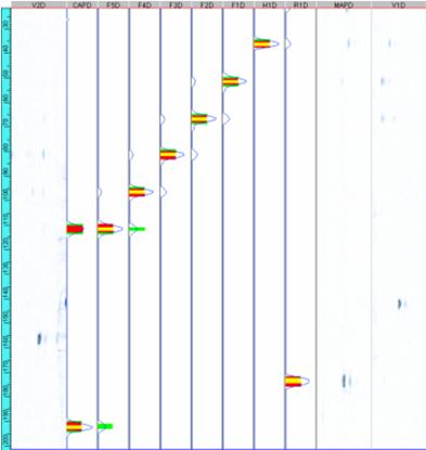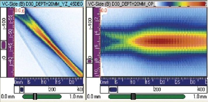 Results of inspection on 2.75” (70mm) dia. Pipe with induced 6.9mm x .5mm OD notch. Note signifigant sharpness of data and improved sizing using CCEV probe. Data taken utilizing COBRA Scanner. Sizing done via – 6dB drop method.