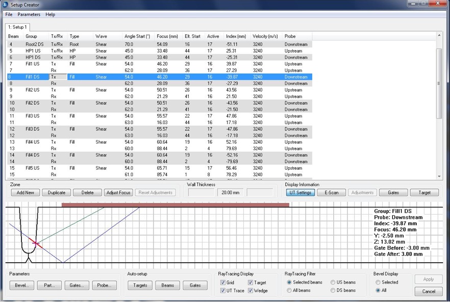 The zone discrimination technique entails splitting the welded joint into small zones (typically 1-3mm) and using a pitch and catch technique focusing a single ultrasonic beam into each one of these zones. By using separate groups of phased array elements the historical need for cumbersome multi-probe systems consisting of many conventional transducers is eliminated and the bevel can be inspected at the proper angle of incidence. Tofd and phased array sector scans in addition to transverse probes can be added as needed for the inspection. After the joint design is input into the software, the PipeWIZARD software calculates each beams position emission and reception and other properties which then can be adjusted on a suitable calibration block accordingly. The main data output is a strip chart, one strip for each beam or zone. Color coding and other tools allow for quick assessment of detected anomalies to acceptance criteria levels. The scan speed can reach up to 100 mm /second, depending on pipe details and inspection parameters. Along with length of defect the height is accurately calculated for fracture mechanics or engineers’ critical assessment criteria which can often reduce defect rate versus workmanship criteria found when used with other techniques.