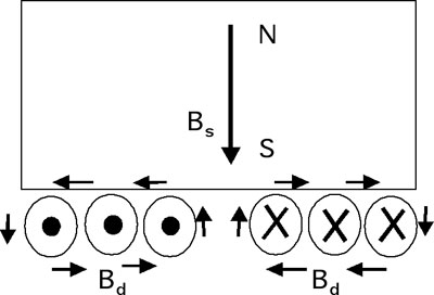 磁致伸缩EMAT探头由一块强永磁体和一个线圈组成,当探头被检测仪器发出的激励脉冲驱动时,其表现如同一块电磁铁,如图1所示。永磁体会创建一个垂直于氧化层表面的磁场(下图中的Bs),而当线圈被脉冲激励时,由电磁铁(Bd)创建的动态磁场会导致氧化层在径向上向外和向内拉伸,如图2所示。