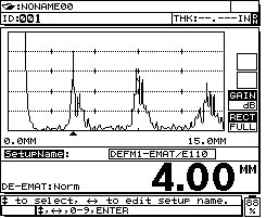 E110-SB探头与39DL PLUS测厚仪和一个 1/2XA/E110适配器配合使用,不仅可以识别探头,还可以提供适当调节信号所需的附加高通滤波。插入适配器后,测厚仪将自动选择EMAT默认设置:DEFM1-EMAT/E110。