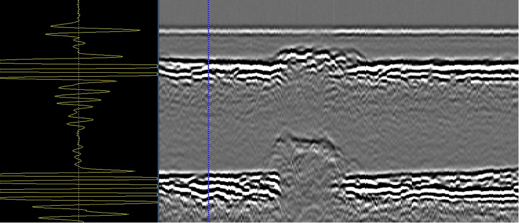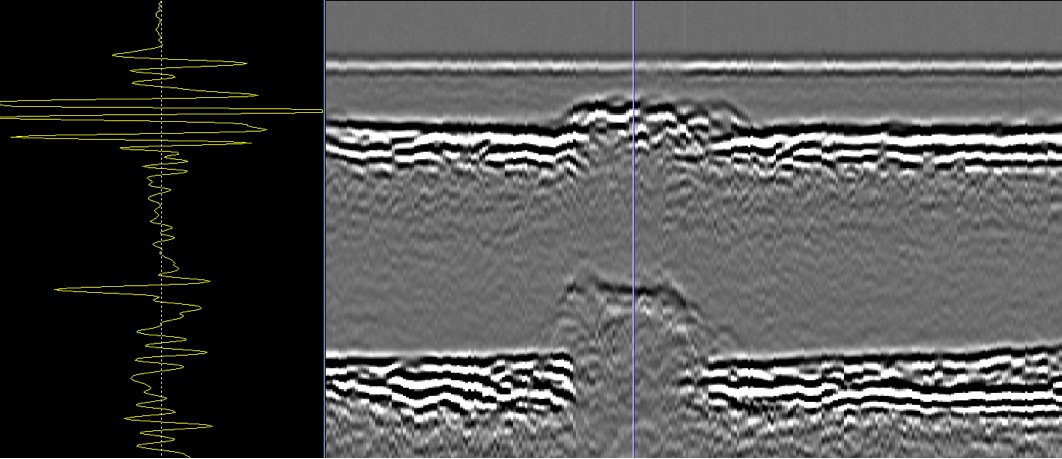 Scan of weld with cursor positioned on an uncorroded area; A-scan shows good lateral wave and back wall signal with no indications in between.
