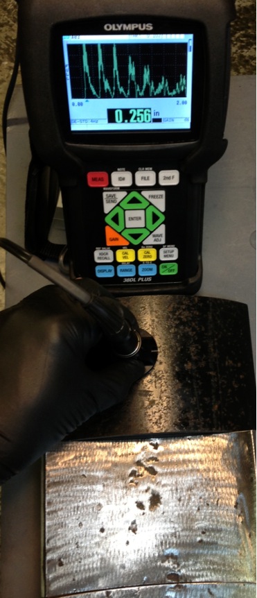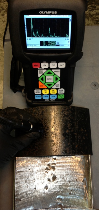 Thickness gaging is performed in the same manner as a corrosion survey. In the picture at left, the gage is reading full wall thickness. In the picture at right, the thinner reading indicates a wall thinning artifact on the inside surface.
