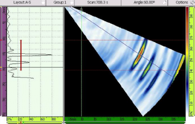 我们在实验室使用加热到150 °C的组件对探头和楔块进行了测试。测试所使用的是OmniScan MX2探伤仪,所完成的检测是分辨率为1度的从横波40°到70°的典型扇形扫查。探头和楔块之间使用甘油耦合,楔块和组件之间使用高温耦合剂耦合。