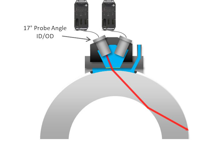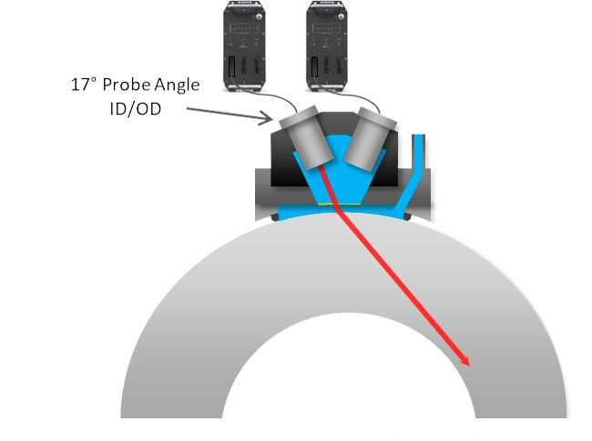 在检测壁厚在50.8毫米以上的管道时,这种旋转管材检测解决方案可以使用在水楔内以不同角度安装的两个探头,探测到内壁和外壁的纵向刻槽缺陷。