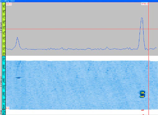 图5和图6显示了一个管道扫查的示例。在图5的滚动视图中,X轴代表管道的轴向长度,Y轴代表内壁和外壁缺陷的探测波幅。在滚动视图的下方是一张映射图,也显示了管道周向的完整二维(2D)结果。图6中示例管道的壁厚为75毫米,探测到内壁刻槽和外壁刻槽的信噪比(SNR)分别约为15 dB和22 dB。