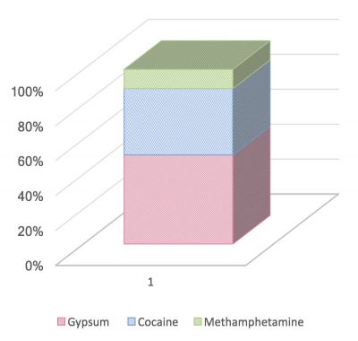 这个样本中除了含有非法药品:可卡因和脱氧麻黄碱(冰毒),还含有数量可观的石膏(填充材料)。使用红外光谱法,不能将这种不纯的药品辨别为可卡因或冰毒。使用奥林巴斯的X射线衍射技术,则不仅可以将其辨别为非法药品,还可以对其进行定量分析,从而有助于完成进一步的调查。 |