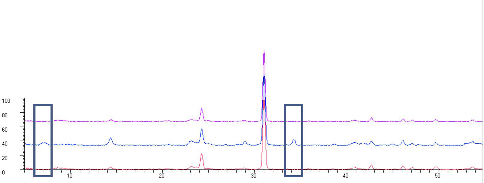 | 图3:X射线衍射跟踪图,法医专家可对图中不同颜色的曲线进行比较分析。红色曲线来自从受害人的鞋底收集的土壤样本,蓝色和粉色曲线分别来自从两个嫌疑人的鞋底收集的土壤样本。在现场采集的X射线衍射跟踪图表明蓝色曲线代表的嫌疑人不在犯罪现场,因为在7和34度2θ处,蓝色曲线出现了峰值,而在代表受害人的红色曲线上没有出现峰值。 |