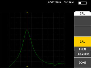 | 机械阻抗分析(MIA)的技术规格(仅B600M)> 校准向导 | 校准菜单,基于探头的响应确定适当频率。 |