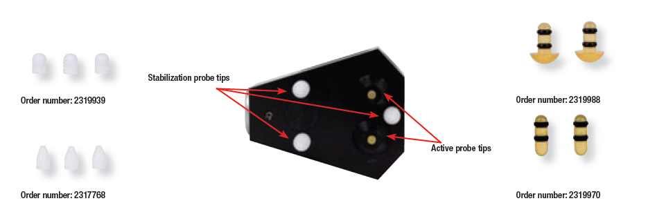 探头配置包括2个固定的或弹簧加载的探头端部,以及起稳定作用的3个白色塑料脚。频繁或不恰当的使用会导致端部性能退化。通过执行以下步骤可以轻松快速地更换新的端部或塑料脚。