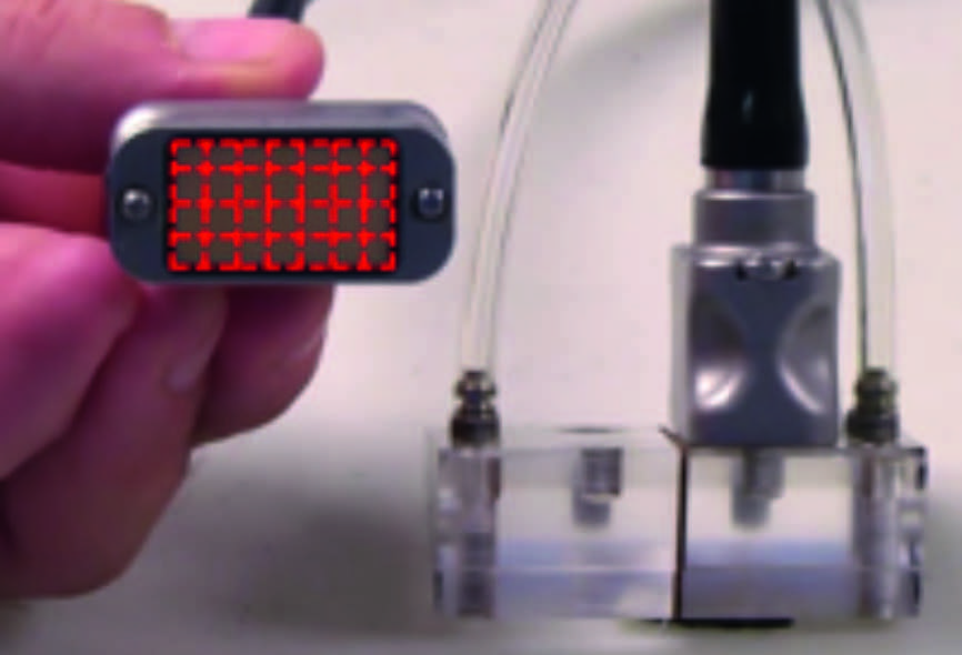 D CouplingA final consideration when determining an inspection protocol is the issue of coupling. With the TRL technique, the wedge holds two probes generating two UT beams. This means that there are two different exit points located at different areas on the wedge (figure 21). Consequently, the inspection can be more sensitive to coupling issues. Careful attention must be taken to avoid air bubbles between the two probes and the component. This can be done using either a manual or an electric water pump. | ![]() Figure 21: The TRL Technique and CouplingeWith the TRL technique, there are two exit points (black arrows) that need good coupling as opposed to one single point for the pulse-echo technique. |