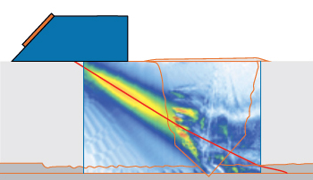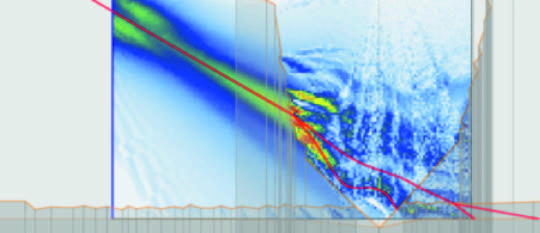 One of the main considerations when inspecting challenging welds is selecting the wave type for the inspection. When scanning a weld, longitudinal waves show a better transmission of the energy of the UT beam than shear waves. Modelling the effect of the propagation mode on the UT beam (figure 4) shows that the beam undergoes a higher degree of skewing when shear waves are used. Therefore, despite potential interference from reflected shear waves, longitudinal waves are recommended for