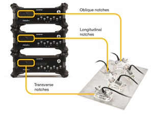 纵向和斜向缺陷 奥林巴斯的64晶片探头与垂直于焊缝线方向放置的正常方向水耦合楔块一起使用,可以确保正确探测到整个焊接区域中的纵向和斜向缺陷。在检测中还可以通过倾斜探头,加强对斜向缺陷的探测和定量能力。 | 横向缺陷 奥林巴斯的64晶片探头与平行于焊缝线方向放置的横向水耦合楔块一起使用,可以方便地对横向缺陷进行探测。这些探头可以确保覆盖完整的焊接区域。 |