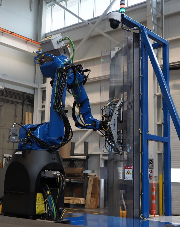搅拌摩擦焊缝(FSW)检测系统是一个功能齐备的交钥匙检测站,可以被直接安装在生产线上。 大型圆柱形燃料箱的焊缝被呈送到协作机器人(Cobot)面前。机器人将检测头定位在焊缝上,然后燃料箱旋转,直到整个周向焊缝得到检测。接下来,燃料箱被移走,并对下一个燃料箱的焊缝重复以上检测过程。 系统的主要组成部分: - 创新型检测头中的所有水楔对被测工件施加一致、恒定的压力,从而可获得优质的耦合效果