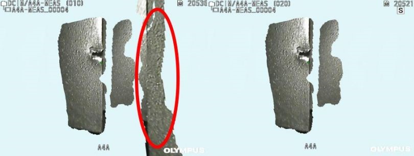 例如,下图显示的是飞机检测中的凿痕。右侧的定子叶片遮挡视域,使得测量变得棘手。要聚焦于目标,只需使用切片模式即可从图像中删除不需要的定子叶片。