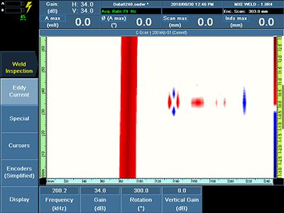 2. 粗糙的表面不会降低检测速度动态提离补偿功能有助于确保探头对粗糙焊缝的表面开裂缺陷和腐蚀区域保持较高的灵敏度。即使在使用了3毫米提离的情况下,也能可靠地探测到缺陷。 | ![]() 粗糙表面的C扫描 |