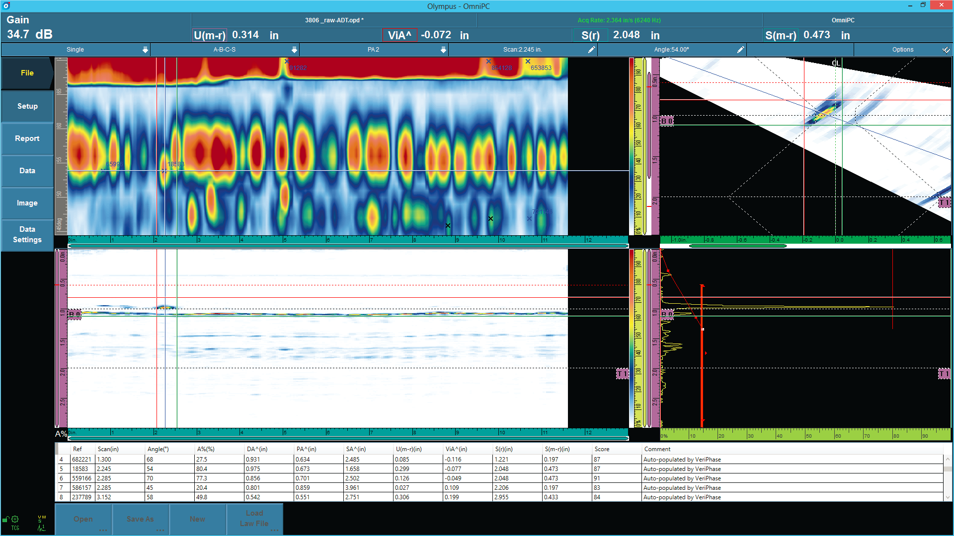 ADT软件使用原始数据文件。这就意味着,闸门放在哪里并不重要,软件会查看探伤仪采集的所有数据,并将这些数据填充到缺陷报表中。软件会将光标自动放置在其探测到的每个缺陷指示上,并在缺陷报表中