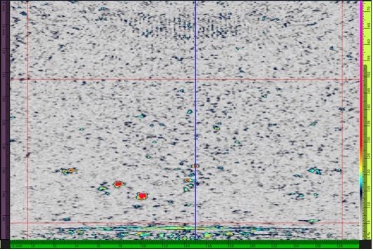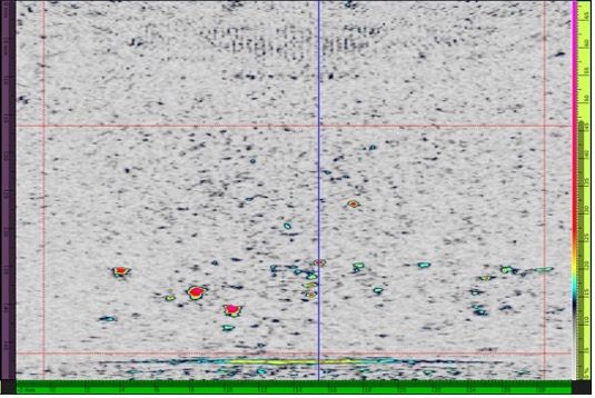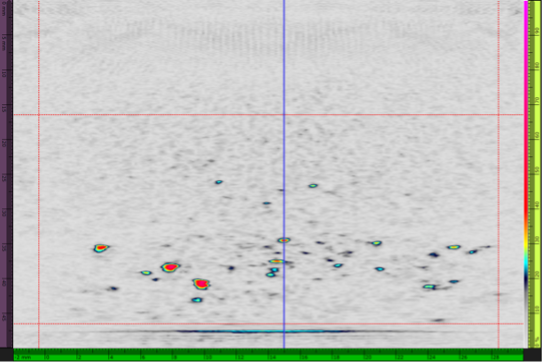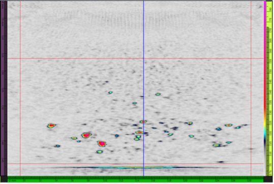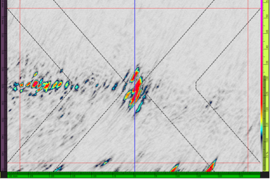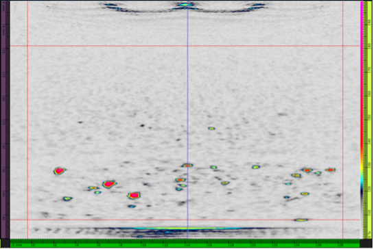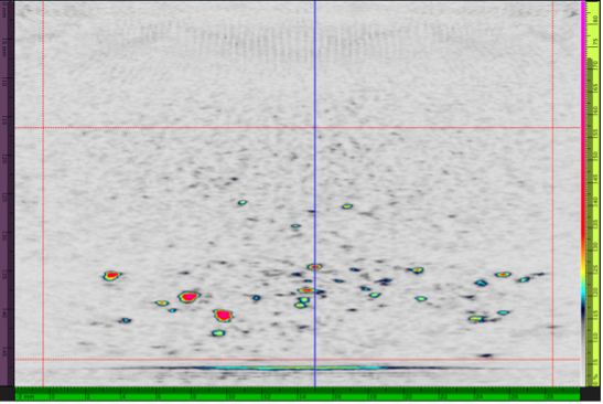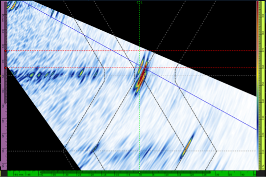 第二种测试配置是厚度为47 mm、具有人造高温氢致缺陷的试块。测试使用10L64 A32探头在接触模式下进行。