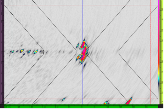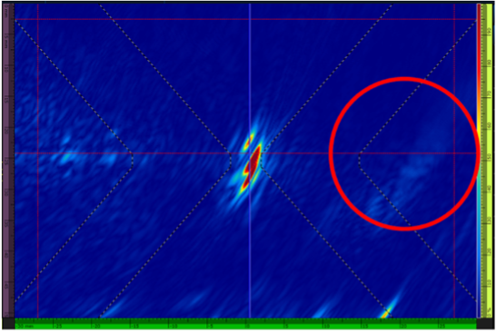 在这里我们可以看到,相控阵超声检测可以显著提升扫查速度,但获取的检测信息量远不及全矩阵捕获和平面波成像。高温氢致缺陷是这些技术大放异彩的应用领域。平面波成像比全矩阵捕获返回的信息更多,不会在底角产生信号,并且底面回波信号较弱。