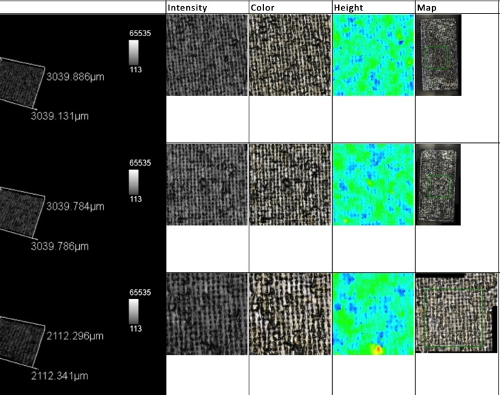 ![]() 使用长工作距离的50倍物镜捕获的3 mm × 3 mm区域的彩色扫描图像。 | ![]() 此图中显示为同一区域的高度图。 |