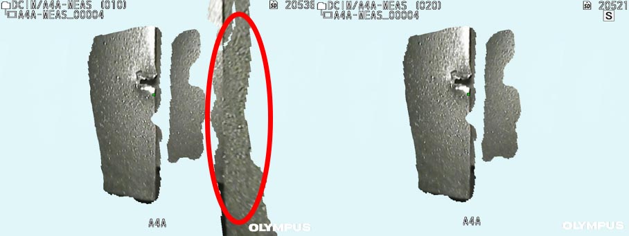 例如,下图显示的是飞机检测中的凿痕。右侧的定子叶片遮挡视域,使得测量变得棘手。要聚焦于目标,只需使用切片模式即可从图像中删除不需要的定子叶片。
