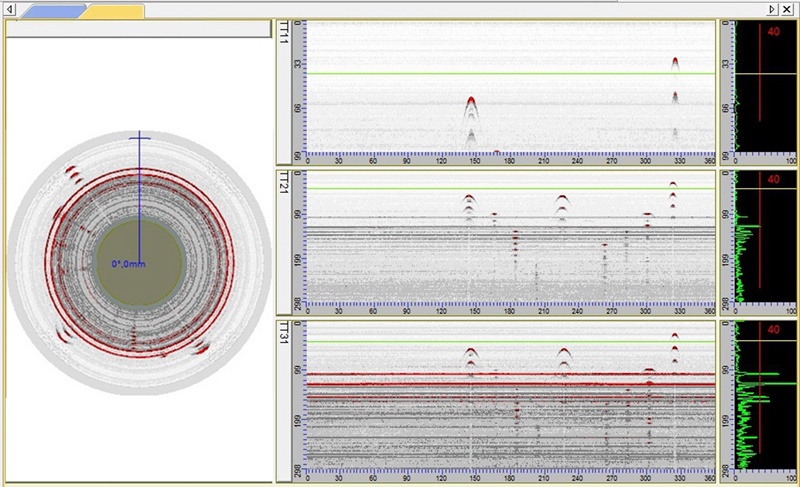- 操作人员可以通过带状图和车轮的侧视图轻松查看车轮中是否存在缺陷,然后他们再使用A扫描和B扫描来确定缺陷的详细信息,如位置、深度和严重程度。