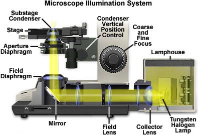 透射光显微镜:显微镜需要配备多个光学元件,才能在光源与被观察标本之间实现科勒照明。这些元件包括集光透镜、视场光阑、聚光器光阑,以及聚光器透镜。集光透镜的作用是从光源中采集光,并使采集到的光在聚光器光阑所处的平面上聚焦。然后,聚光器透镜再使这些光穿过透镜并投射到被观察的标本上。