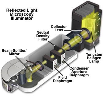 在反射光显微镜中设置科勒照明所需的主要光学元件的排列方向正好与在透射光显微镜中这些元件的排列方向相反。聚光器的孔径光阑要接近光源,而视场光阑要接近标本。在反射光显微镜中,物镜有双重作用:从上向下时,物镜起到的是一种正确对齐的聚光镜的作用,可以控制光线照射在标本上的角度。从下向上时,物镜的数码孔径(NA)可以确定捕获从标本反射回来的光线的角度。如果所有其它条件都相同,则数码孔径越高,物镜的分辨率就会越好,因而标本图像的分辨率也就越好。
