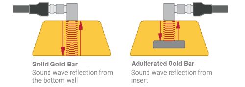 探伤仪发出的声波会从金条底部、金条内的掺入物(如钨金属)或内部空隙处反射回来。使用探伤仪可以对从金条底部反射的声波和从金条内部掺入物或孔隙反射的声波进行区分。