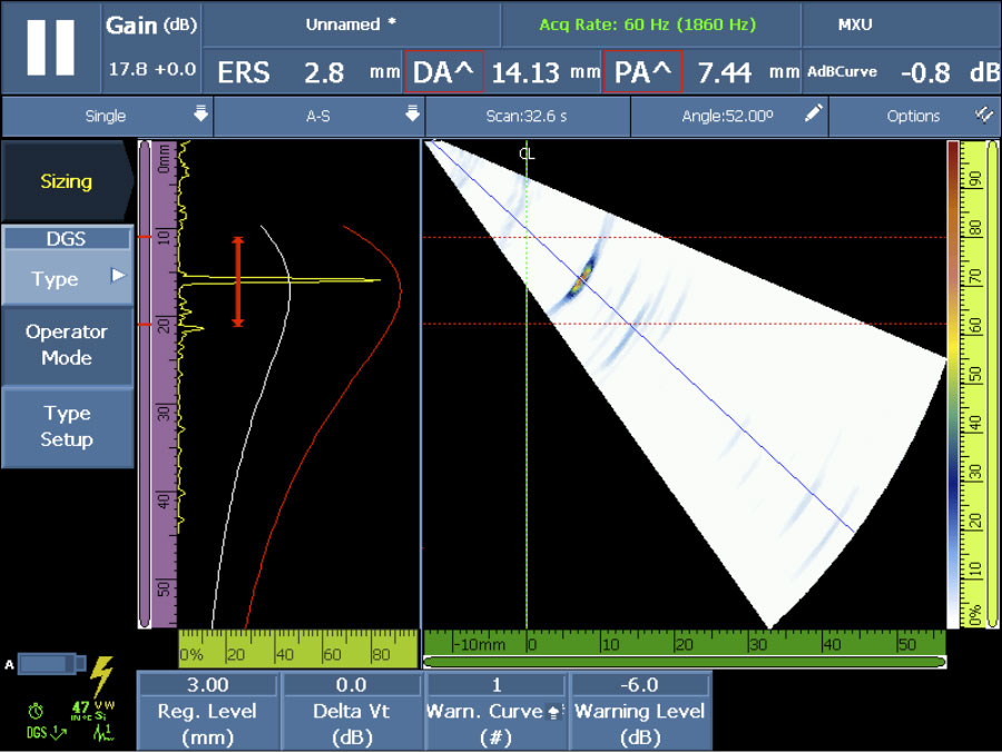 | 上图的仪器屏幕中显示了校准过的DGS曲线,以及在完成了校准向导中的步骤后,可以在检测过程中实时进行调整的一系列参数。 |