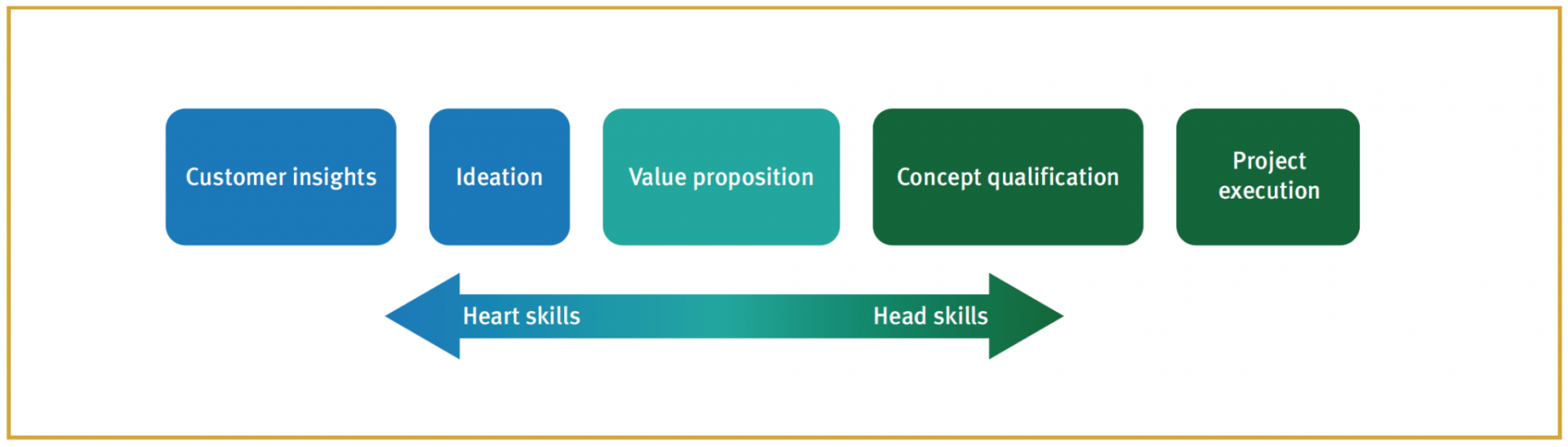 Figure 3. A blend of women and men along the innovation value chain makes it stronger by matching skill sets with roles. The first half focuses on marketplace insight and ideation, which require heart skills (emotional intelligence and teamwork), while the second half (qualification and execution) requires head skills.