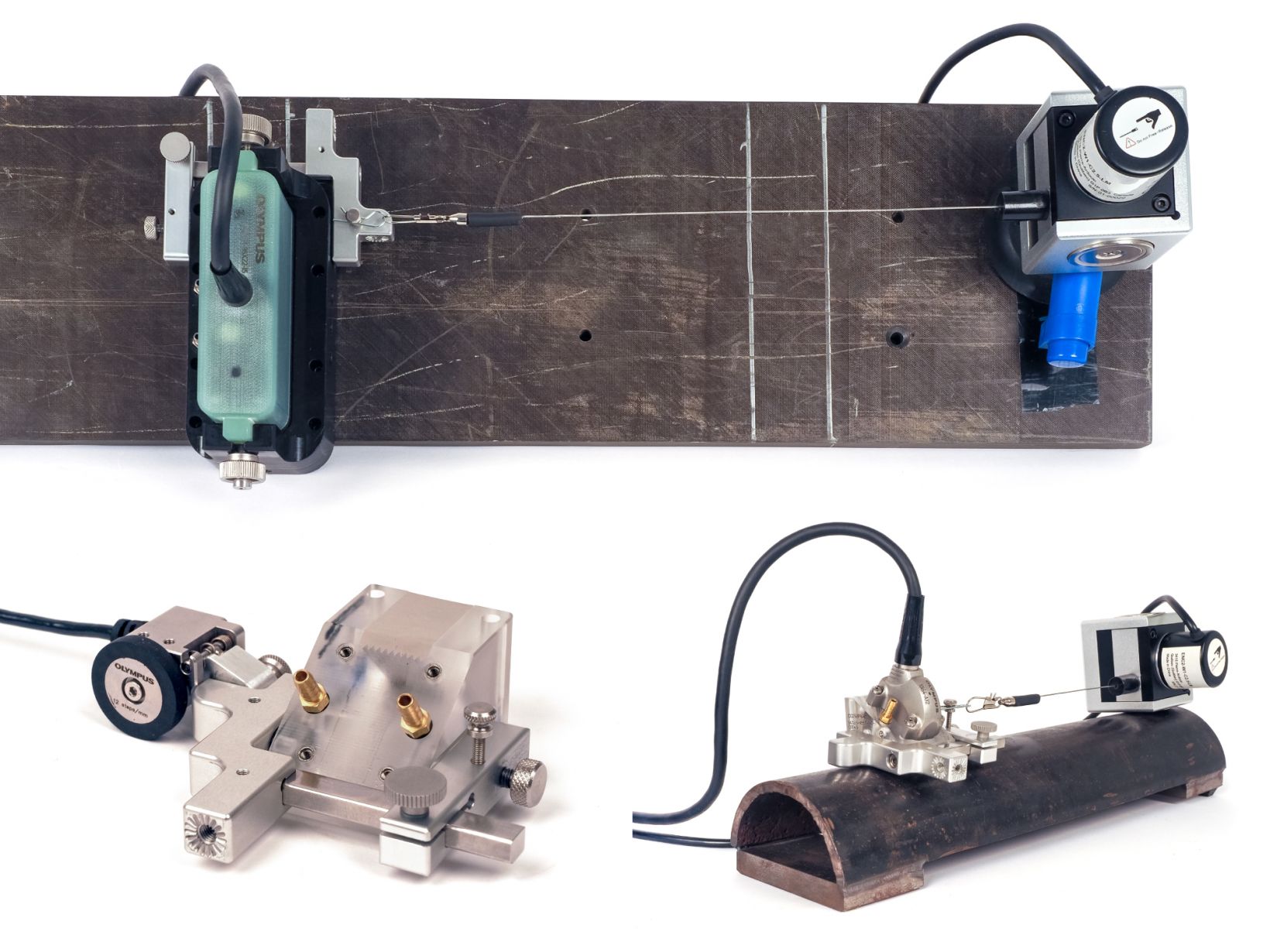 将通用托架添加到您的检测设备中,可使您为更多的部件形状和尺寸创建配置。您还可以增加用于编码检测的探头和楔块的类型,使其用途更为广泛。在无法使用楔块的情况下,可以将楔块直接连接到相控阵探头上,进行接触式检测。
