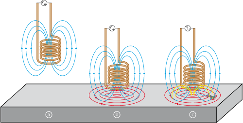 Eddy current array and conventional eddy current technology share the same basic principle. Alternating current injected into a coil creates a magnetic field (in blue). When the coil is placed over a conductive part, opposed alternating currents (eddy currents, in red) are generated. Defects in the part disturb the path of the eddy currents (in yellow). This disturbance can be measured by the coil.
