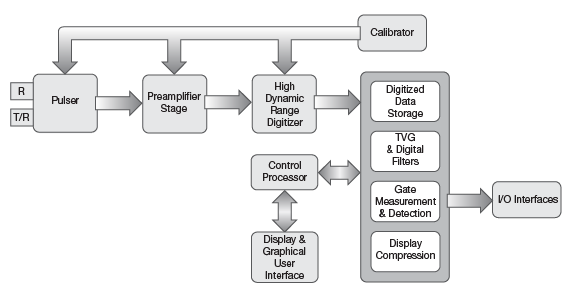 下面显示的是一个典型当代超声探伤仪的方框示意图。在模拟图的前端,脉冲发生器以所选脉冲重复频率为探头提供一个高压脉冲,生成向外发送的超声波。从被测样件返回的回波由探头接收,并转换为电信号,然后再被传输到接收器中。回波根据需求被放大,然后通过一个高动态范围数字转换器模块完成数字化,这个数字化转换器模块可以处理超声无损检测中各种常见的信号波幅。基于微处理器的控制和时序逻辑使脉冲发生器和数字转换器同步,并选择将要被进一步处理和显示的波列的部分。使用校准器校准DC偏移、增益、相位和通过数字转换器的模拟前端的频率响应。这种校准方案可确保无漂移操作、仪器线性,及仪器之间的可重复性;这是超声仪器的数字处理超出模拟信号处理的主要优势特点。