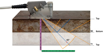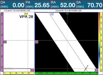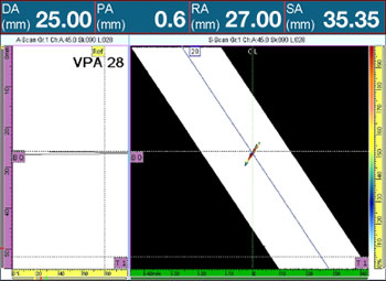 常规探伤仪一般将楔块上的单一声束入射点作为参考点,计算深度和距离。在这个示例中,第一个视图中上面的读数表明底部反射体在声束入射点前面的25毫米出现,其深度为25毫米,从声束出射点到反射体之间的测量声程为35.35毫米。第二个视图中上面的读数表明顶部反射体在声束入射点前面的50毫米出现,处于表面上(其深度为0),从声束出射点到反射体之间的测量声程为70.71毫米。视图右下角出现的1L1和1L2读数表明第一个跨度与第二个跨度之间的不同:1L1为闸门1第一个跨度的缩写形式,1L2为闸门1第二个跨度的缩写形式。