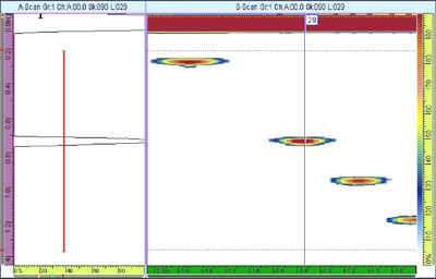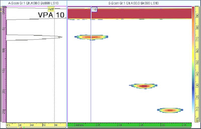得到的图像可清晰显示扫查区域内几个孔的相对位置。在这个图像旁还显示有由一个所选孔径生成的A扫描波形图。本例中的所选孔径为第29个孔径(共有49个孔径),这个孔径所包含的晶片编号从29到45,由用户可控制的蓝色光标标示。声束与工件中第二个孔洞相交的点显示在A扫描波形图中。