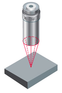 声束形状:我们用以下这个比喻可以有效说明这个概念。典型的未聚焦圆盘探头发出的声束经常被想象成一束源自活动晶片区域的能量柱,这个能量柱在一段时间内以直线形式传播,然后其直径扩散,最终消失,就像来自聚光灯的光束一样。