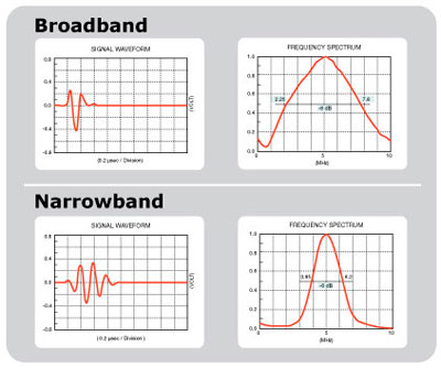 带宽:典型的测厚探头不会在纯粹单一的频率下生成声波,而会在以额定频率值为中心的频率范围内生成声波。带宽是处于特定波幅范围内的频率响应的部分。在使用接触式、延迟块式和水浸式探头进行的厚度测量应用中,通常需要较宽的带宽。