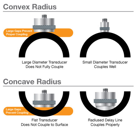 几何形状:随着工件表面曲率的增加,探头与被测工件之间的耦合效率会降低,因此,随着曲率半径的增加,通常应该减小探头的尺寸。在急转圆角(特别是凹弧面)上进行测量,可能需要特殊轮廓的延迟块探头或非接触水浸式探头,以获得适当的声耦合效果。延迟块和水浸式探头也可用于刻槽、腔体和接触受限的类似区域的测量。