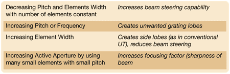 晶片间距和孔径:晶片间距是指两个相邻单个晶片之间的距离;孔径是指发射激励脉冲的晶片的有效尺寸,这种晶片通常是由同时得到脉冲激励的一组单个晶片组成(虚拟孔径)。要优化电子偏转的范围,需要较小的晶片间距。要得到最佳灵敏度、最小的不需要的声束扩散、较强的聚焦,则需要较大的孔径。当今的相控阵仪器通常支持孔径最多为16个晶片的聚焦法则。更为高级的系统最多会支持含有32个晶片或者64个晶片的孔径。