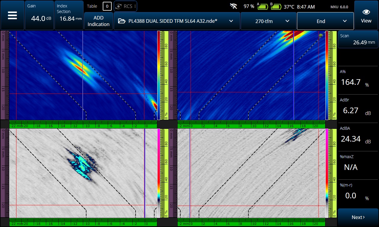 采用具有不同特性的PCI和TFM两种技术,同时从焊缝两侧彻查整个焊缝体积。使用两个探头对焊缝进行一次性扫查,即可显示TFM和PCI结果,以便高效精确地比较、测量和确认缺陷特征。 |